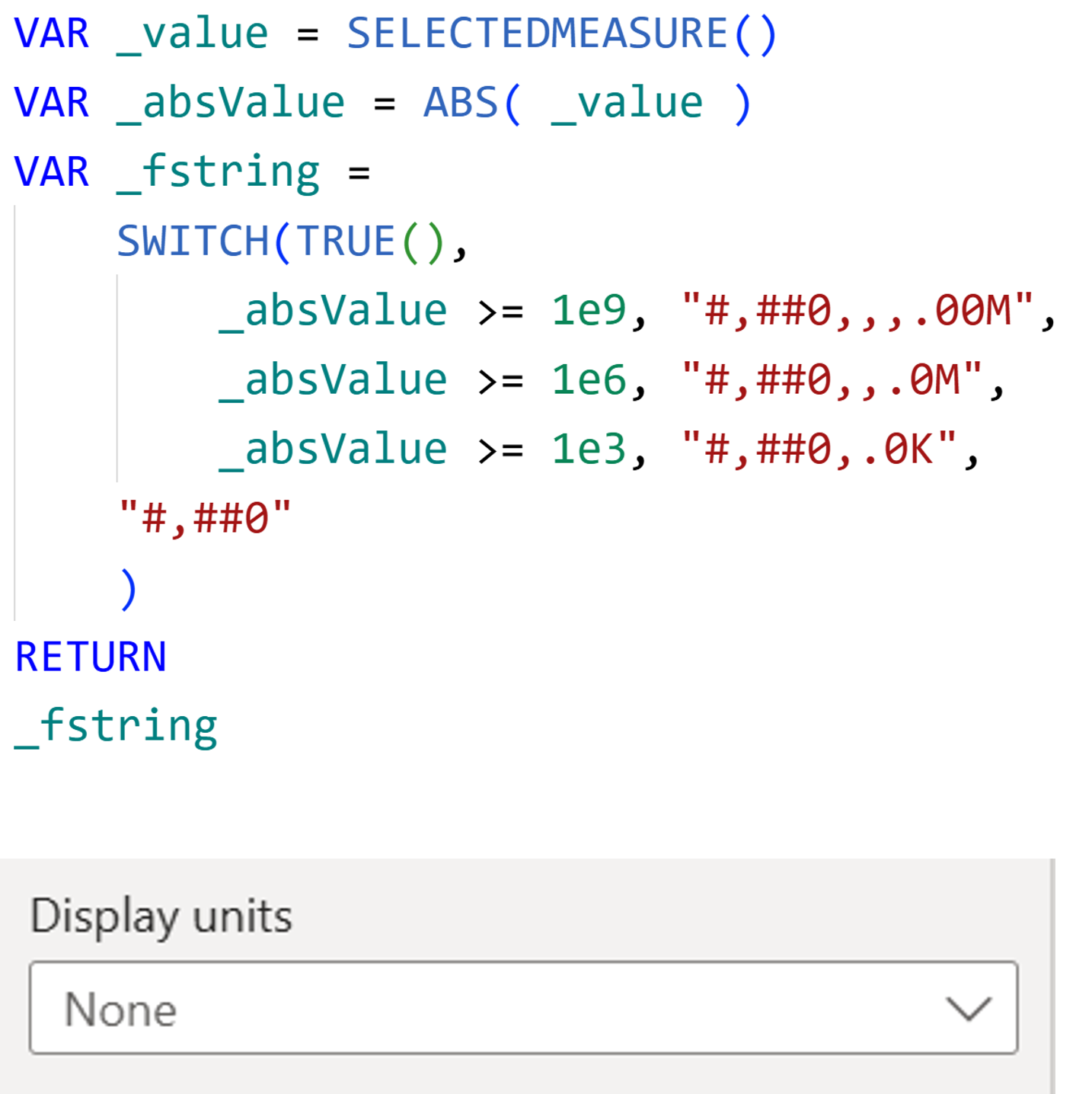 The UDF Solution: Create a function in the DAX Query View. Then, you can simply call the function - pbi.Numberformatting() in any measure's dynamic format. One function, multiple uses.