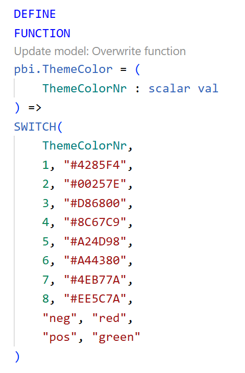 Example 2: Theme Colors for Conditional FormattingSomething that's really been missing in Power BI is the ability to say "I want this conditional formatting to use a color from my theme." You can't do that natively. But with UDFs? Problem solved.