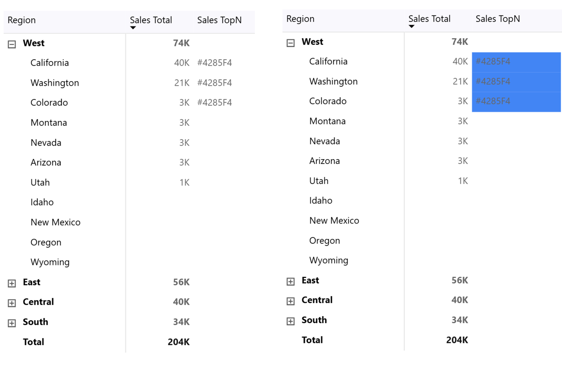 As an example, I've created a measure that checks if a state is in the top three for sales and if so return a specific color. Now, you can go to the measure and call the function. Usually we mention the color name or the color code in the measure. But, now we can just call the function and fill out the parameter value for the theme color we want.