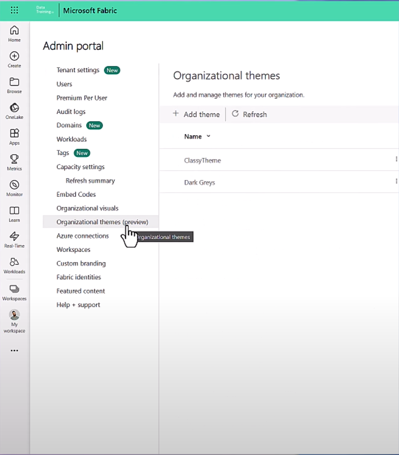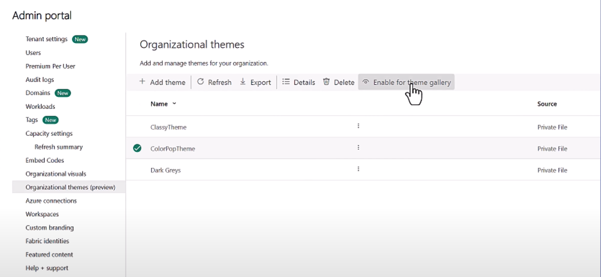 Prerequisite: You’ll need Power BI admin access to add or manage Organizational Themes.