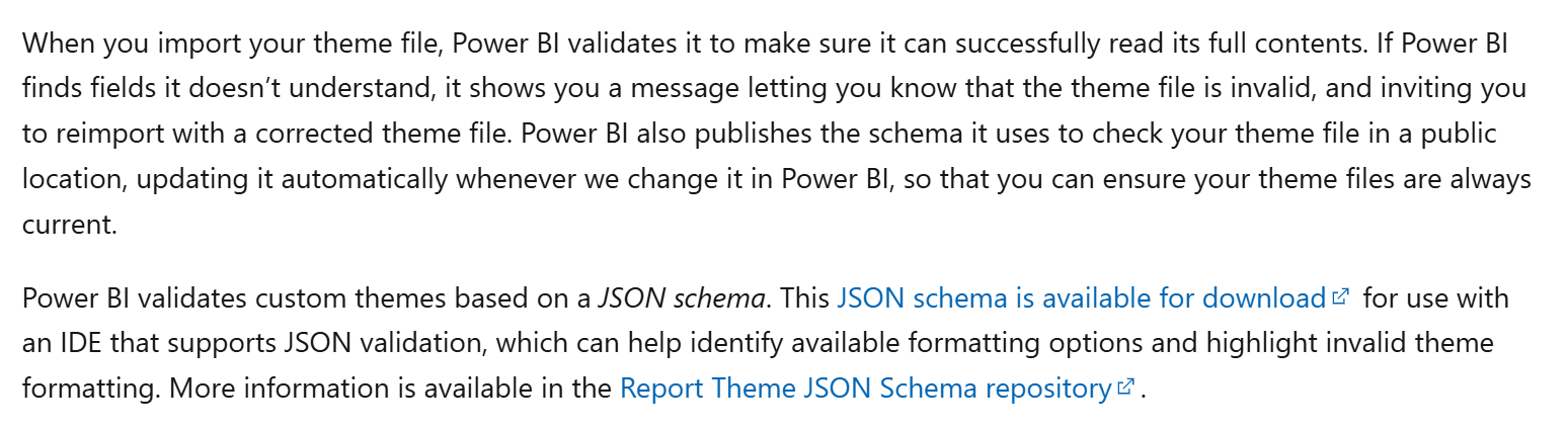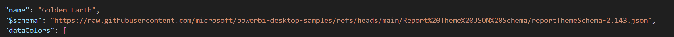 While working on the JSON, if you want suggestions and auto-complete you can add a "schema" reference at the beginning of your file. You can find it in the official documentation under "use report themes in Power BI Desktop". You can access this file from Power BI Desktop by selecting "How to create a theme" from the View option. Look for "JSON schema is available for download" link, click on it and grab the URL and add it in the "schema" reference.