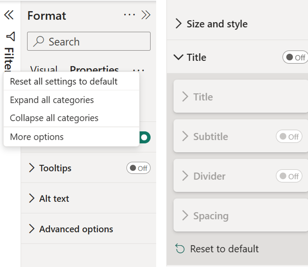 1. Sometimes, the theme won’t seem to apply right away - and that’s usually because the visuals already have custom formatting which means we have already manually updated it. Power BI won’t override those changes automatically. To fix it, just select the visual and click ‘Reset to default’. That’ll let the new theme take effect as expected. You can do this for the whole visual or you can choose to reset the properties that you wish to make changes, in that case you can use the "Reset to default" at the property level.