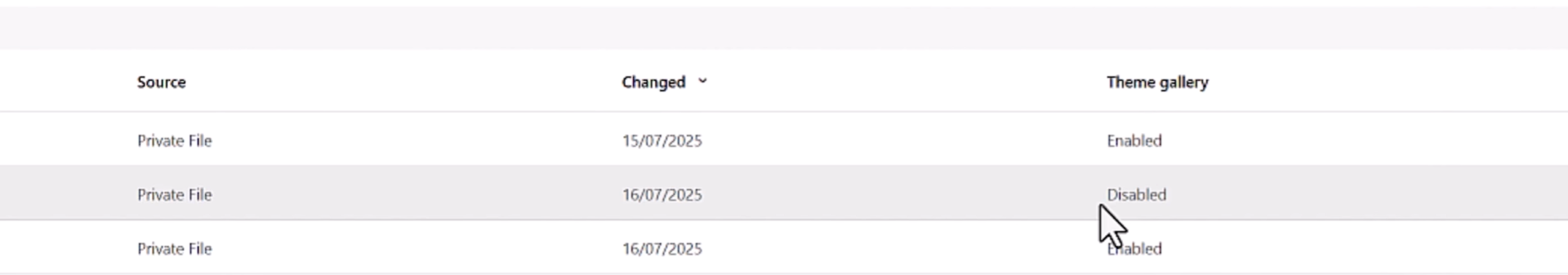 Once it's added, don’t stop just yet as this step alone will not show the theme under the Organizational theme section. Click on the uploaded theme, you will notice it is disabled.