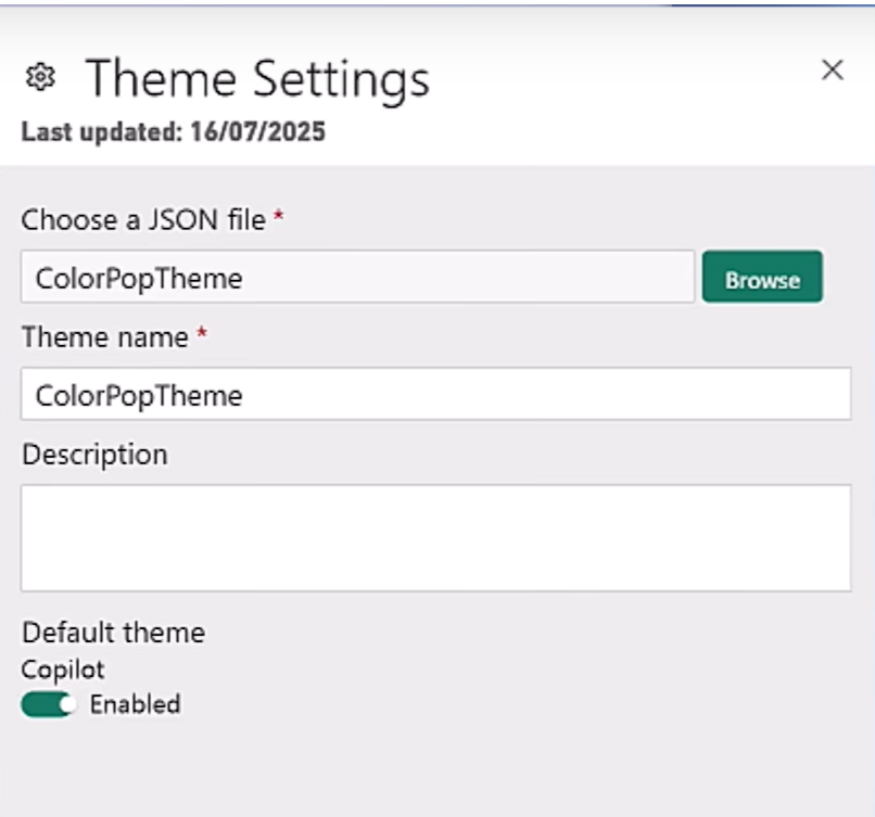 3. Upload Your Theme FileHere you will be able to add a short description, and you’ll also see an option to make this theme default for Copilot-generated reports.