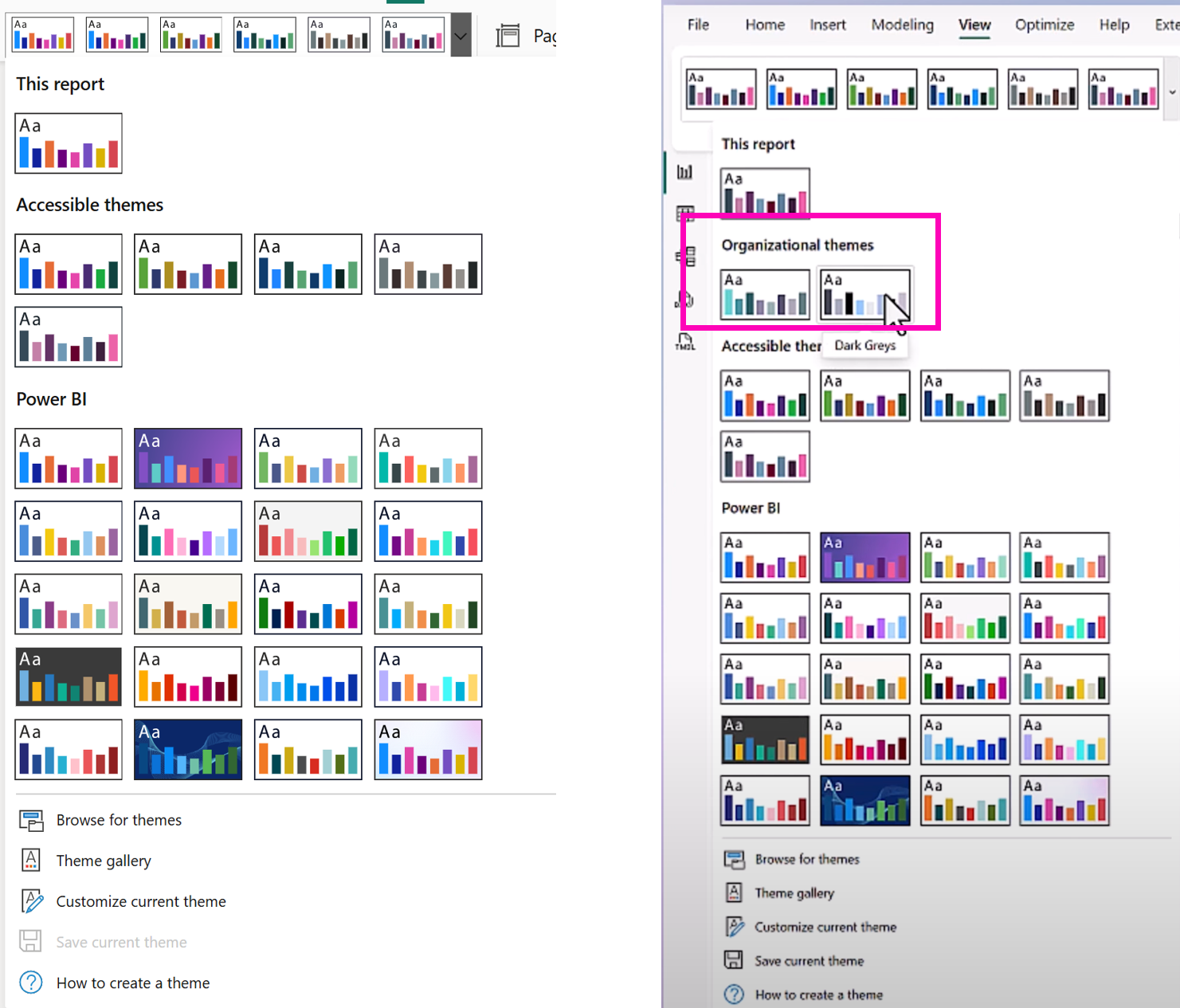Once that’s done, go back to Power BI Desktop → View → Organizational themes, and your theme will be right there.