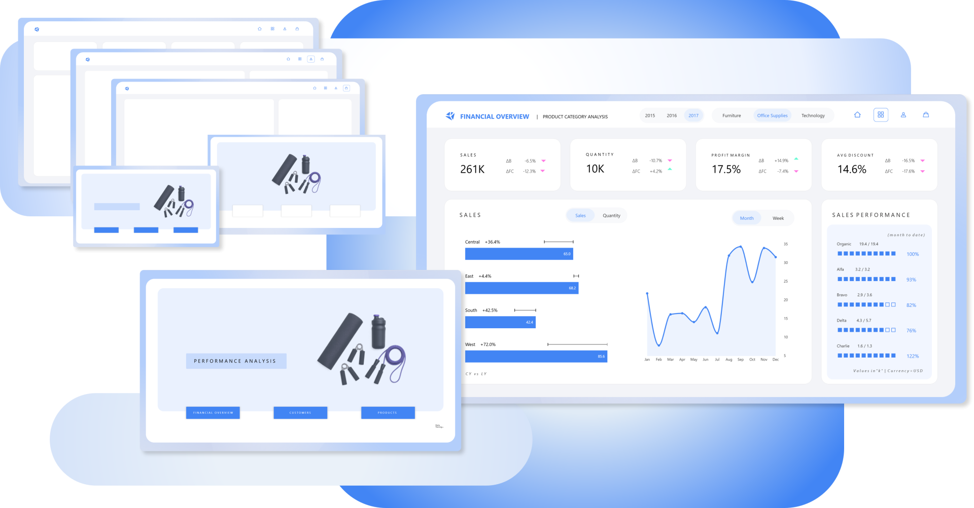 Arctic Breeze brings a light interface inspired by winter air and clear northern skies. Soft blues, frosted panels paired with light grey creates a refreshing sense of space and focus. With this base anyone can create a report that feels effortless, modern, and bright.