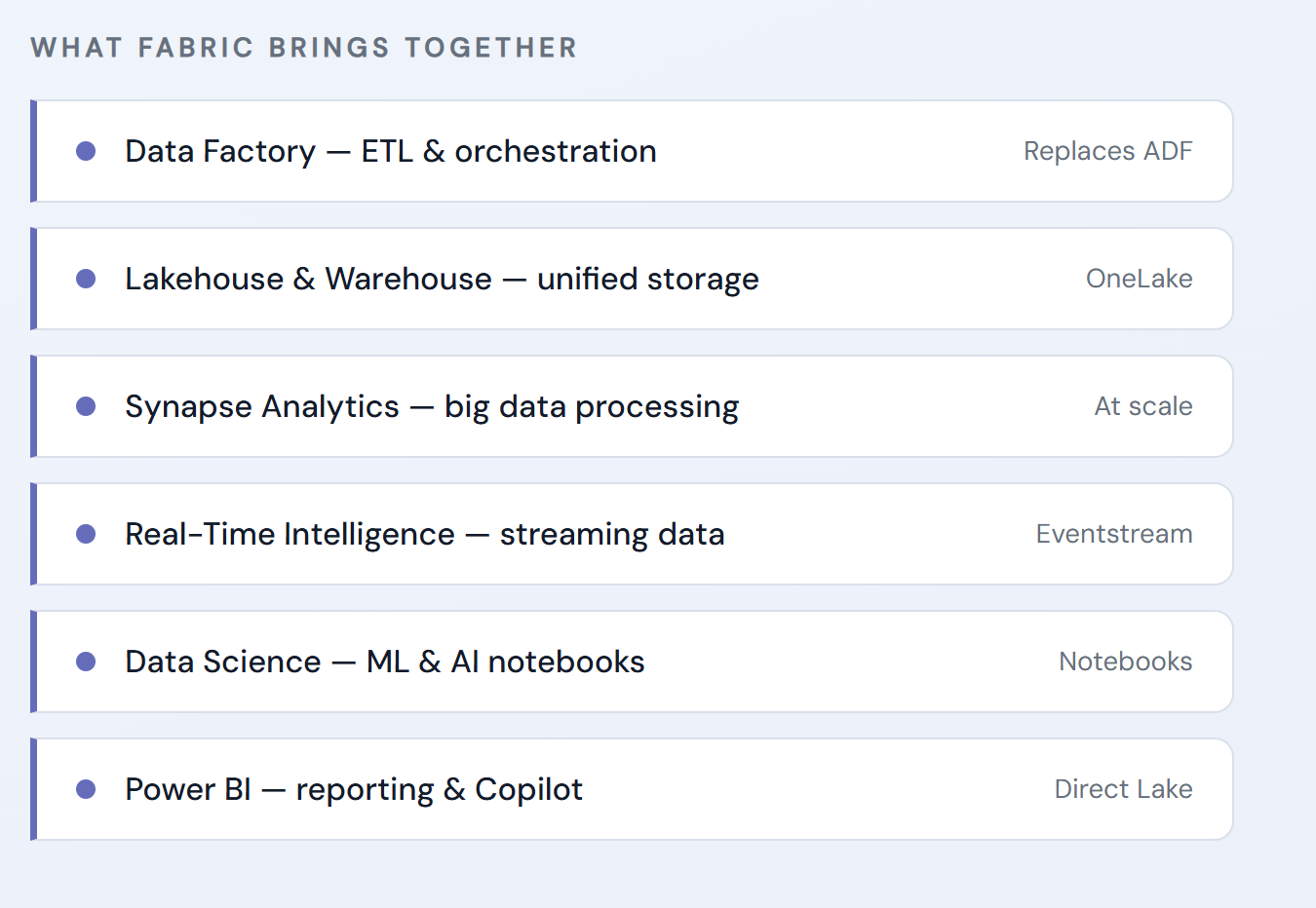 You're managing Azure Data Factory, Synapse, SQL servers, and Power BI separately. Fabric consolidates this into one governed, cost-efficient platform.